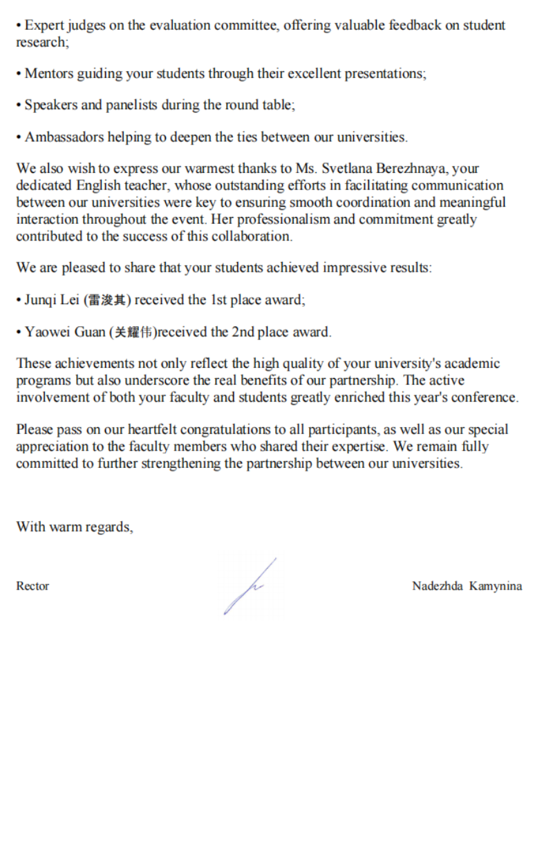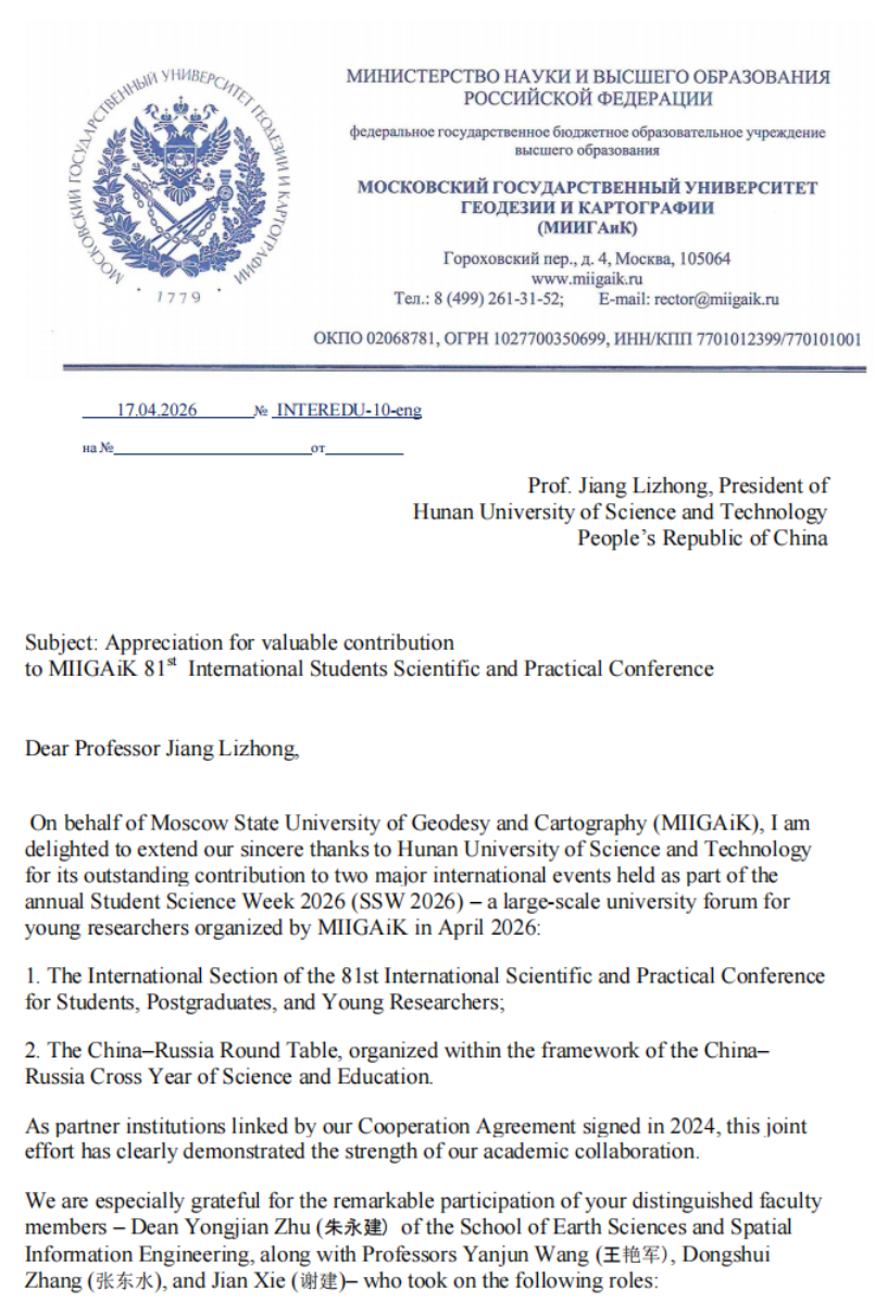 4月15日至16日,a片网 与莫斯科国立测绘大学共同举办了第81届国际科学和实践线上研讨会“the 81st International Scientific and Practical Conference for Students, Postgraduates and Young Researchers, Student Science Week-2026 (SSW-2026)”,a片网 院长朱永建教授在会上致辞,介绍了a片网 “湖科大二号”卫星发射及学校“一站两中心”建设情况,建议两校在科教融合、人才培养方面开展全面合作。会后,莫斯科国立测绘大学给我校发来感谢祝贺信。